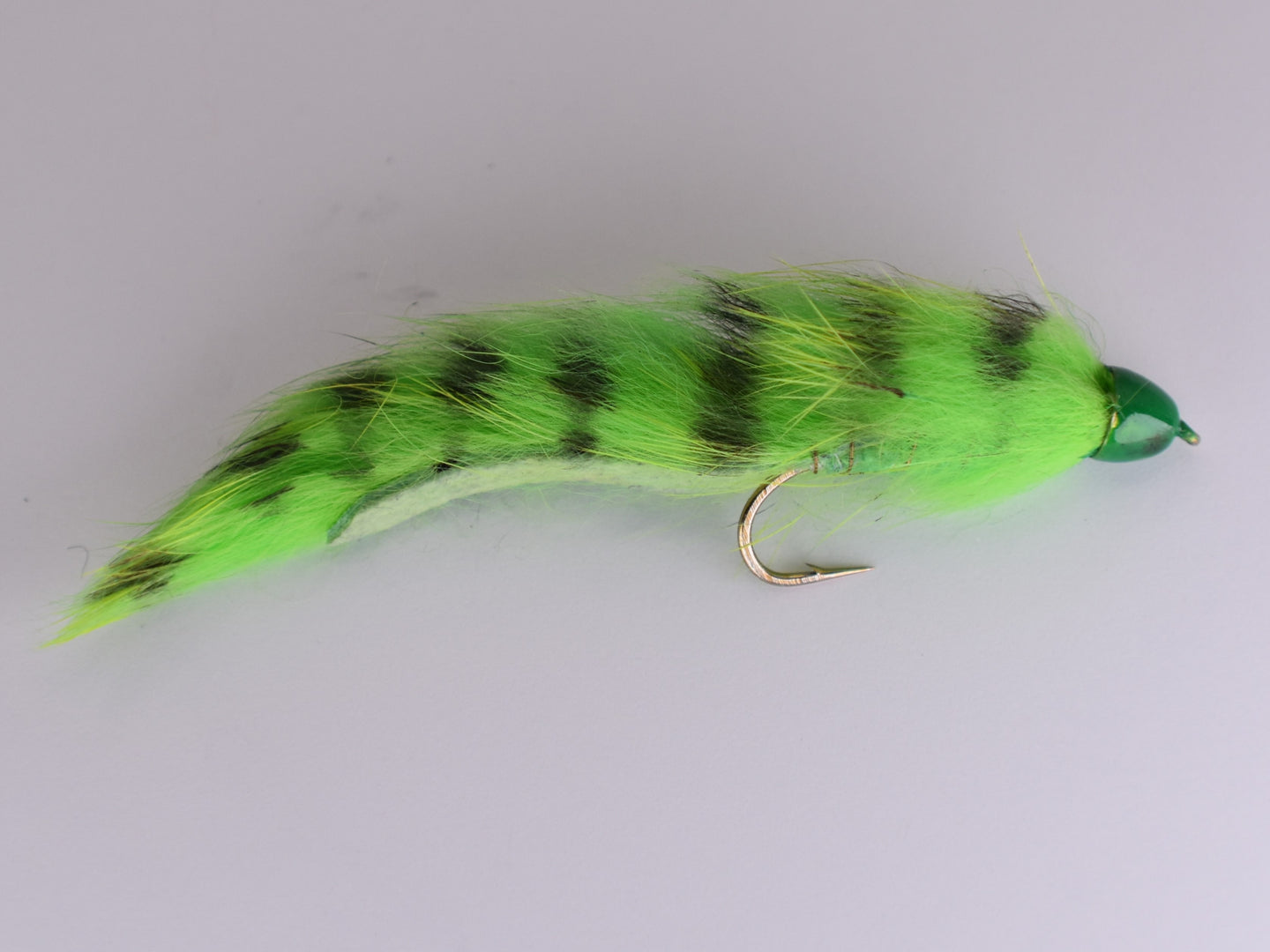 Conehead Zonker Green Barred е универсална и високоефективна муха, завързана на кука Daiichi, известна със своята острота и надеждност. Тази муха се отличава с живо зелено тяло с решетки с конусовидна глава за допълнително тегло, което й позволява да потъне бързо и да достигне по-дълбока вода, където рибата се храни. Лентата със заек създава реалистично движение, имитирайки действието на риба примамка или друга плячка. Зелената шарка с ивици добавя визуална привлекателност, което я прави особено привлекателна за хищни видове като пъстърва, костур и други по-малки местни риби в Австралия. Тази муха е идеална за използване в различни водни условия, където нейното реалистично действие и ярко оцветяване могат да провокират агресивни удари.