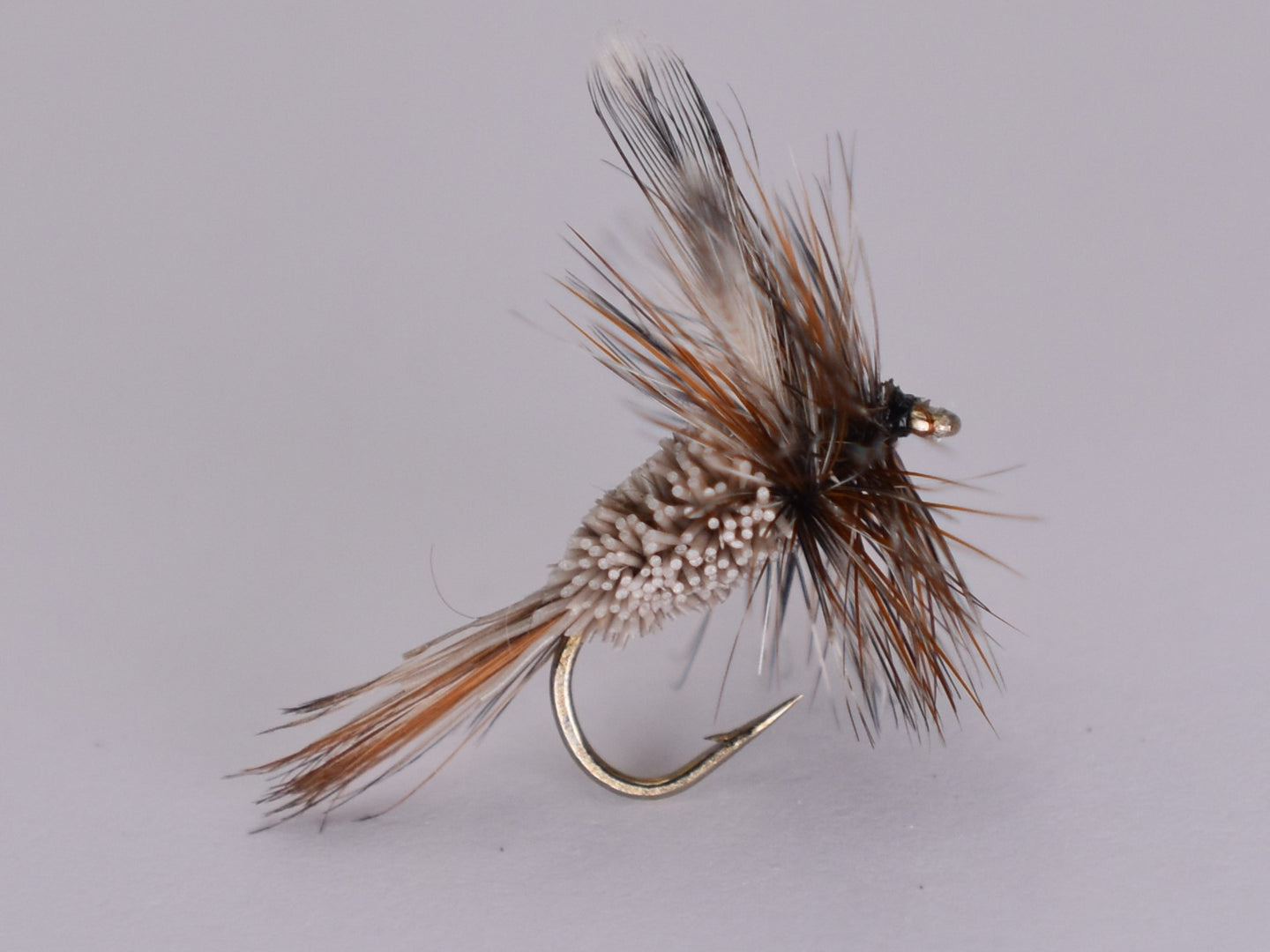 -35%The Adams Irresistible, tied on a Daiichi hook, features a grey, spun deer hair body, grizzly and brown hackle tail, and a standard upright wing. This buoyant dry fly is particularly effective for targeting trout, especially in fast-moving waters where flotation is key.