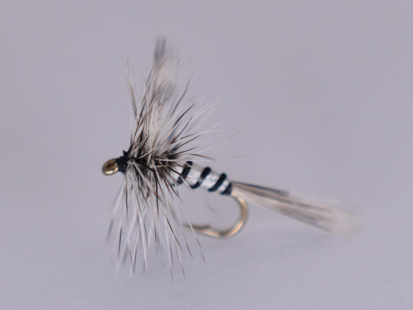 The Mosquito fly is a delicate and realistic dry fly pattern designed to imitate the natural mosquito; a common insect found near freshwater bodies. This fly is particularly effective in still water and slow-moving river environments, where mosquitoes are prevalent. The Mosquito fly is tied with a slender body, grey with black ribbing to mimic the slim profile of the insect. It often features fine, soft hackles to represent the mosquito's legs and wings, giving it a lifelike appearance on the water's surface.