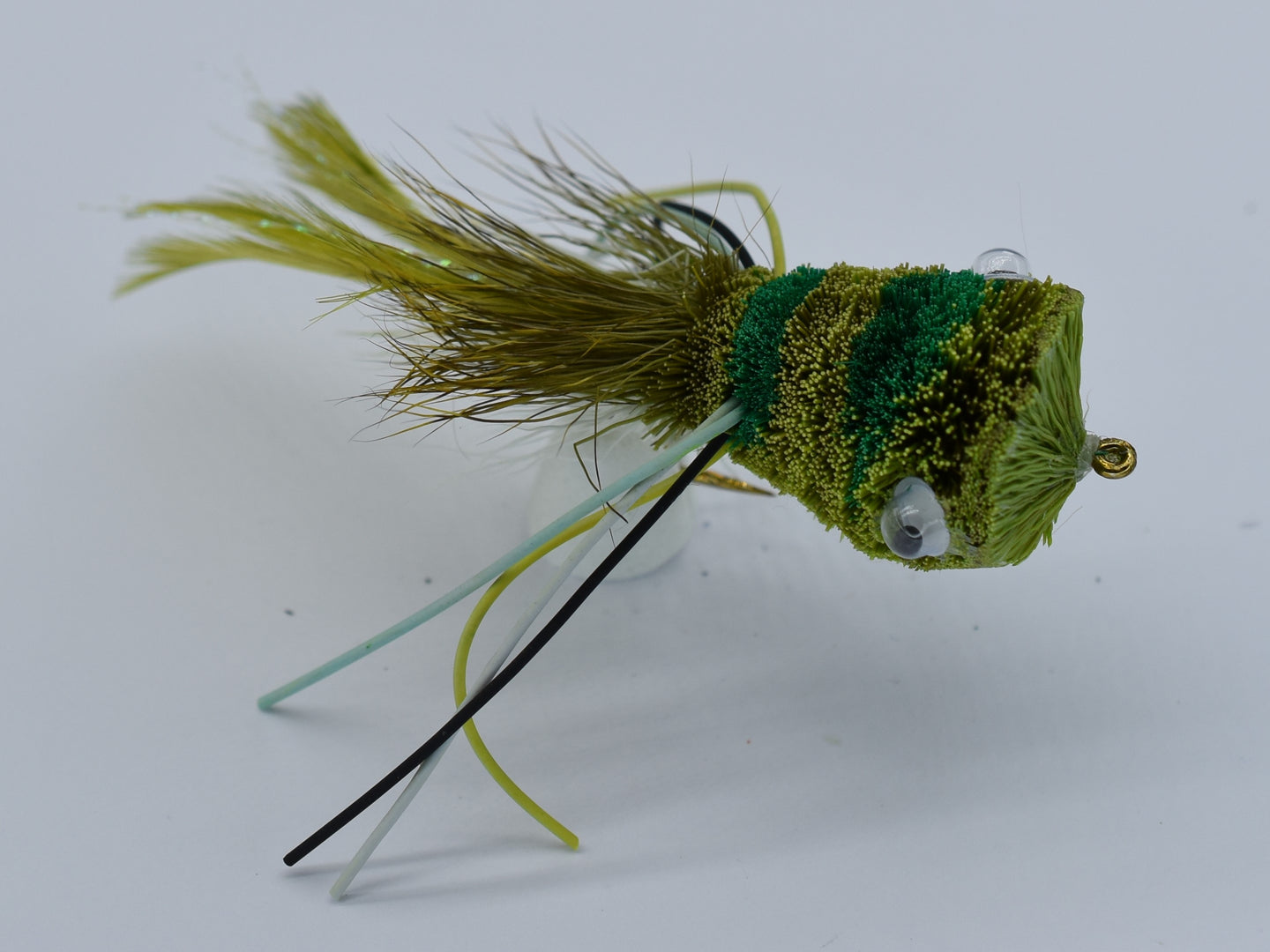 The Popper Deer Hair Frog is a surface fly pattern designed to mimic a frog, a common prey item for many freshwater predators. Crafted from deer hair, this popper features a realistic, buoyant body that sits high on the water, with a wide, flat face that creates a distinctive splash and popping sound when retrieved. The natural texture and appearance of the deer hair make it particularly lifelike, drawing the attention of species like Murray cod, Australian bass, and barramundi. The Popper Deer Hair Frog is especially effective in still waters and slow-moving rivers, where its realistic frog imitation and noisy surface action can entice aggressive strikes from lurking predators.