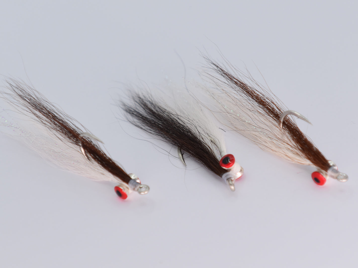 Clouser Deep Minnow er et alsidigt og udbredt fluemønster, særligt effektivt i både saltvands- og ferskvandsfiskeri. Designet af Bob Clouser, denne flue imiterer små agnfisk og er kendt for sin evne til at synke hurtigt, takket være dens vægtede øjne. Dens strømlinede krop, ofte lavet med bucktail, kombineret med de vægtede øjne, skaber en jigging bevægelse, der tiltrækker en bred vifte af arter, herunder stribet bas, smallmouth bass og rødfisk. Clouser Deep Minnow er en favorit blandt lystfiskere for dens enkelhed, holdbarhed og effektivitet under forskellige fiskeforhold. Håndlavet med Gamakatsu SL12 krog.