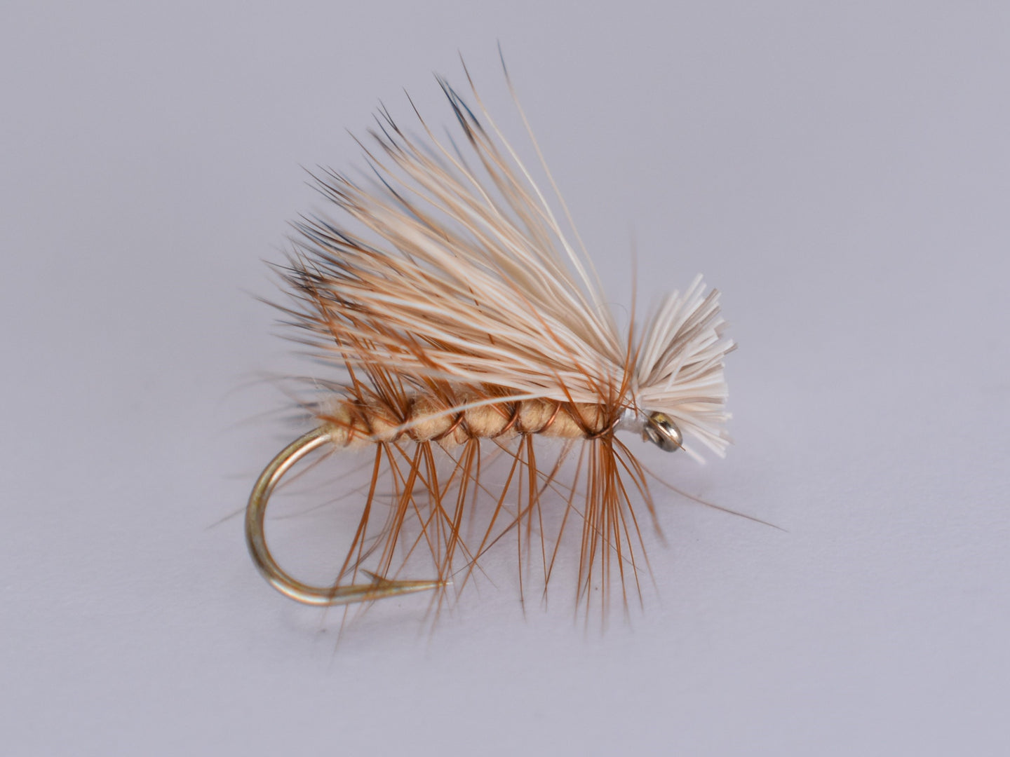 Elk Caddis Tan er et klassisk tørfluemønster designet til at efterligne voksne hestefluer, en almindelig fødekilde for ørreder og andre ferskvandsfisk. Denne flue har en solbrun dubbet krop og en vinge lavet af elghår, som giver den fremragende opdrift og et realistisk, flagrende udseende på vandet. Elghårvingen hjælper med at holde fluen svævende højt, selv i hurtige vandløb, mens dens solbrune krop efterligner den naturlige farve af voksne trollfugle.
