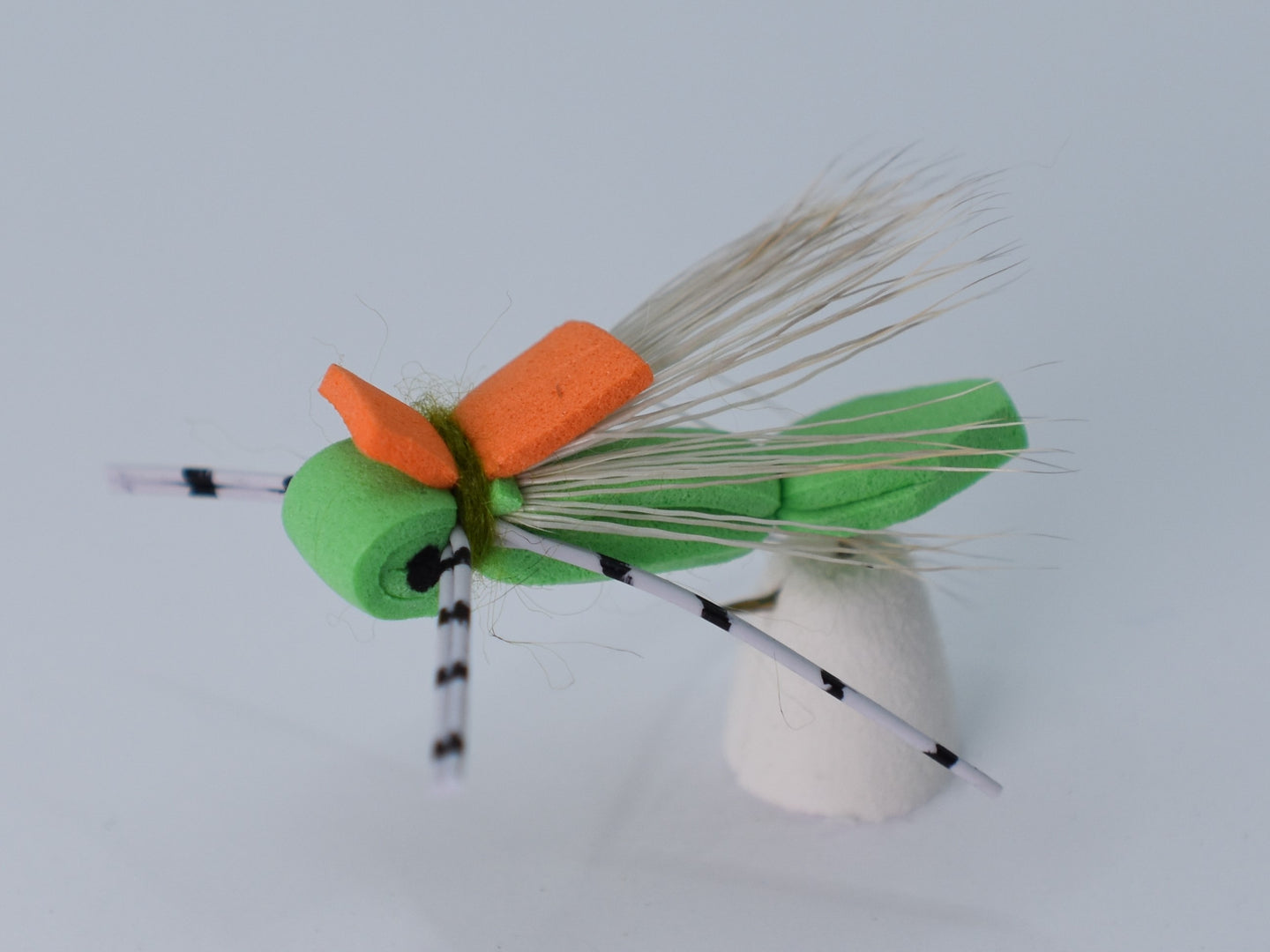 Hi-Vis Foam Hopper Green er et meget synligt og flydende terrestrisk fluemønster, designet til at efterligne en græshoppe, et almindeligt bytte for mange ferskvandsfisk. Konstrueret med skum flyder denne flue usædvanligt godt, hvilket gør den ideel til fiskeri på overfladen i både stille vand og hurtige vandløb. Den grønne farve forbedrer synlighed, selv under udfordrende forhold, mens skumkroppen sikrer, at fluen forbliver flydende. Hi-Vis Foam Hopper Green Yellow er særligt effektiv til at målrette mod arter som ørred, bas og andre ferskvandsfisk, der lever af terrestriske insekter. Dens lyse farver og pålidelige flydeevne gør den til et populært mønster i sensommeren og det tidlige efterår, hvor græshopperne er mest aktive